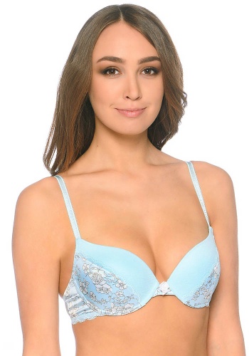 Бюстгальтер классической формы с формованной чашкой с Push-ap для размеров 70AB, 75ABC, 80B и без Push-ap для размеров 70C, 75DE, 80CDE, 85BCD. Детали бюстгальтера выполнены из принтованного атласного полотна и эластичной сетки, декорированы узким кружевом. Центральная деталь декорирована бантиком. Бретели эластичные, не съёмные.