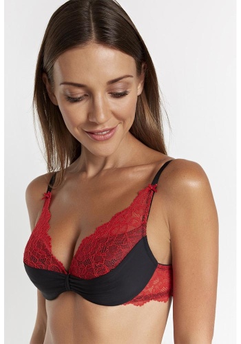Бюстгальтер классической формы с формованной чашкой с Push-ap для размеров 70AB, 75ABC, 80B и без Push-ap для размеров 70C, 75DE, 80CDE, 85BCD. Детали бюстгальтера выполнены из эластичного полотна и кружева. Центральная деталь декорирована драпировкой и перемычкой. Бретели не съёмные, декорированы бантиками и кружевом.