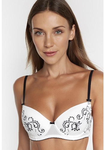 Бюстгальтер формы T-Shirt с формованной чашкой без Push-ap для всех размеров. Детали бюстгальтера выполнены из эластичной сетки и кружева. Центральная деталь декорирована бантиком.