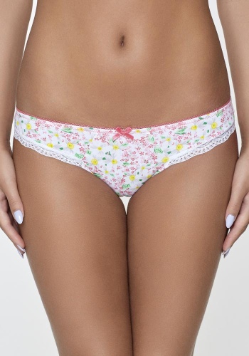 Трусики классические выполнены из эластичного принтованного полотна, декорированы узким кружевом. Линия талии декорирована эластичной лентой с фестонами. Передняя деталь декорирована бантиком.