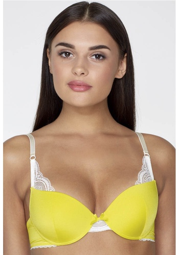 Бюстгальтер классической формы с формованной чашкой с Push-ap для размеров 70AB, 75ABC, 80B и без Push-ap для размеров 70C, 75DE, 80CDE, 85BCD. Детали бюстгальтера выполнены из эластичного полотна и кружева и декорированы эластичной лентой с фестонами. Центральная деталь декорирована бантиком. Бретели эластичные, не съёмные. Передняя деталь декорирована деталью из кружева.