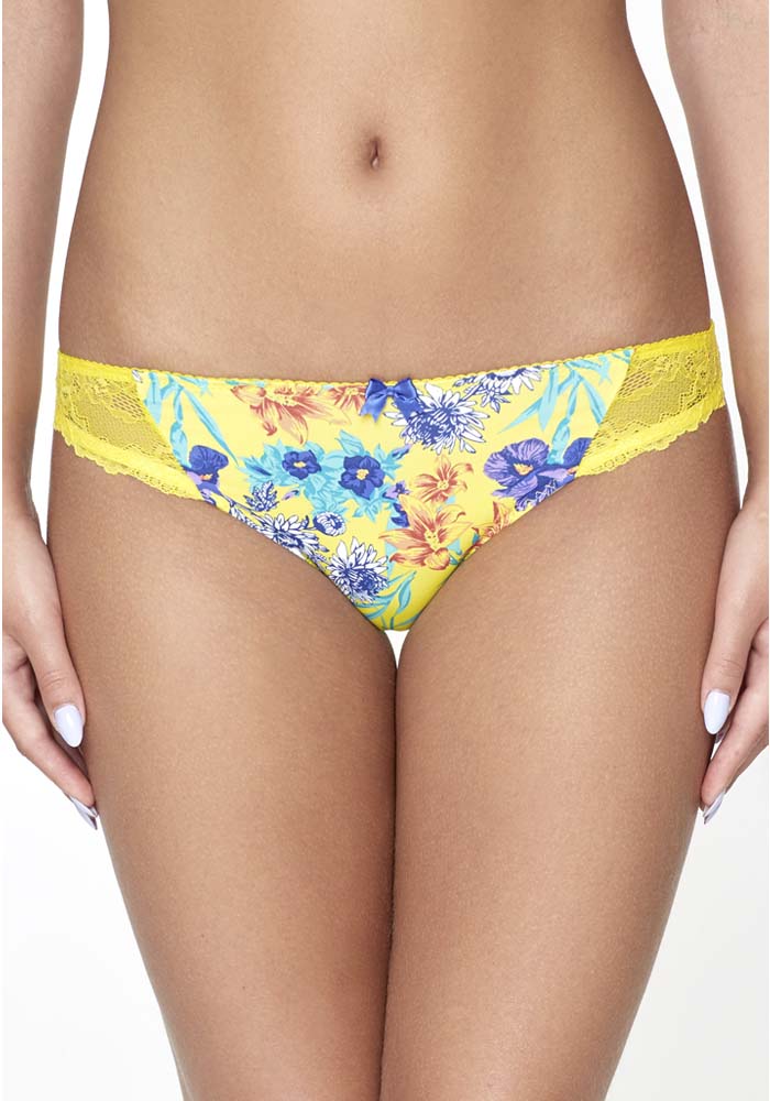 Трусики классические выполнены из эластичного принтованного полотна и кружева. Линия талии декорирована эластичной лентой с фестонами. Передняя деталь декорирована бантиком.