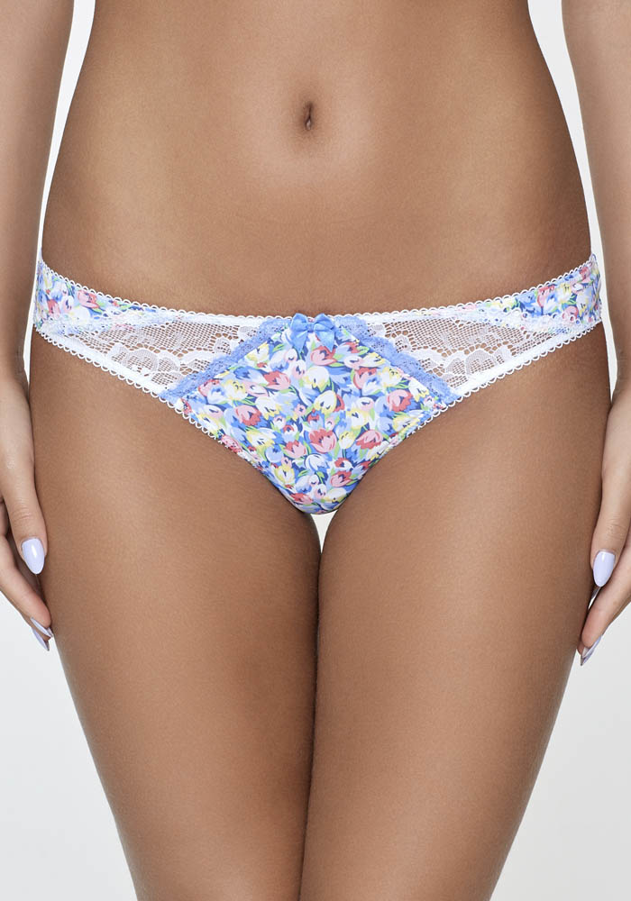 Трусики-стринг выполнены из эластичного принтованного полотна и кружева, декорированы эластичной лентой с фестонами и узким кружевом. Передняя деталь декорирована бантиком.