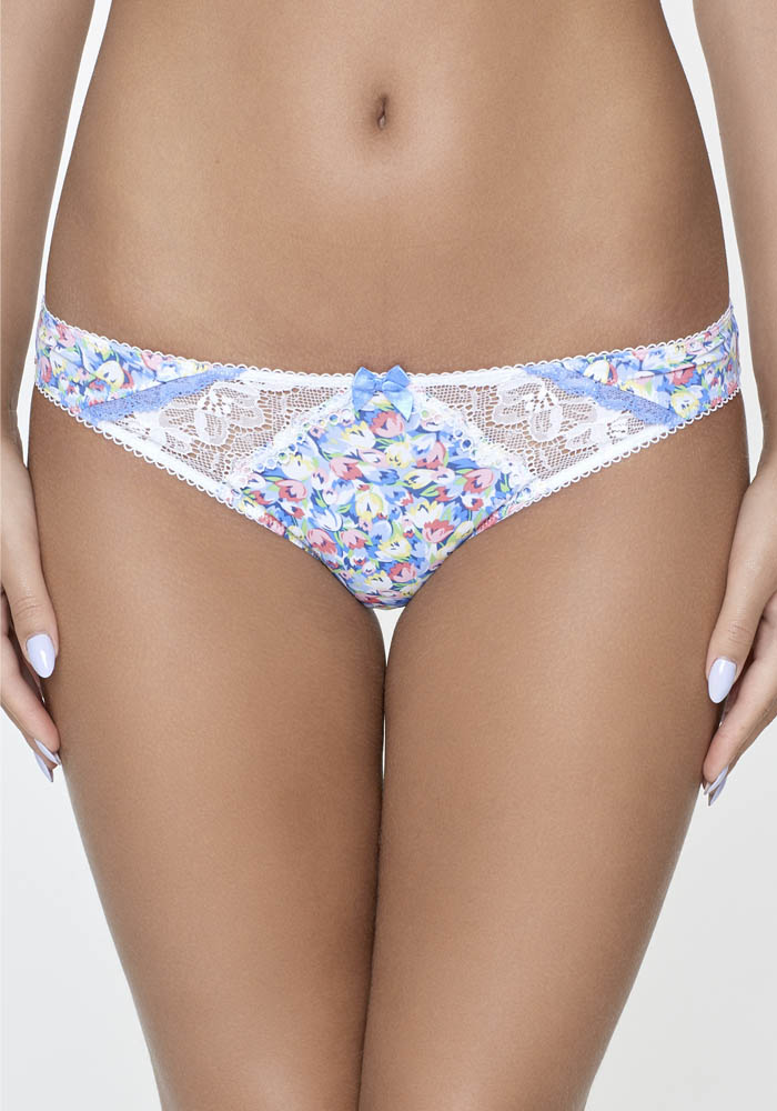 Трусики классические выполнены из эластичного принтованного полотна и кружева, декорированы эластичной лентой с фестонами и узким кружевом. Передняя деталь декорирована бантиком.