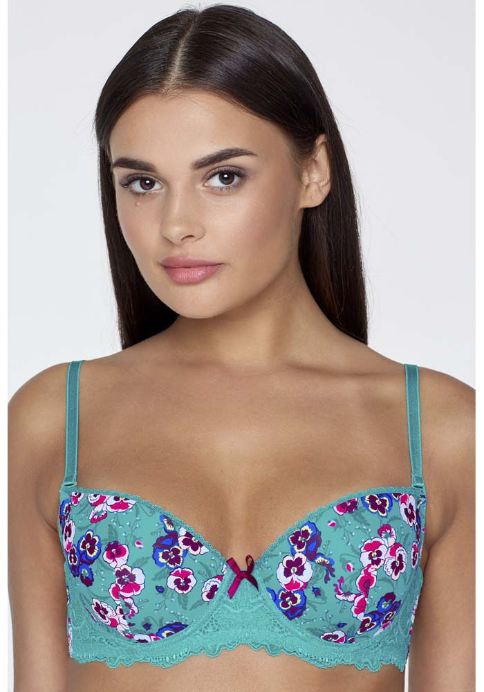 Бюстгальтер формы T-Shirt с формованной чашкой без Push-ap для всех размеров. Детали бюстгальтера выполнены из эластичного принтованного полотна и кружева, декорированы узким кружевом. Центральная деталь декорирована бантиком. Бретели эластичные, съёмные.