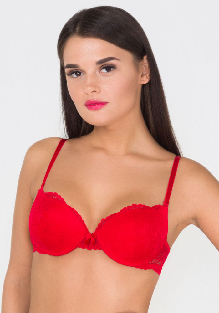 Бюстгальтер классической формы с формованной чашкой с Push-ap для размеров 70AB, 75ABC, 80B и без Push-ap для размеров 70C, 75DE, 80CDE, 85BCD. Детали бюстгальтера выполнены из кружевного полотна и узкого кружева, декорированы эластичной лентой с фестонами. Центральная деталь декорирована атласным бантиком. Бретели эластичные, съёмные.