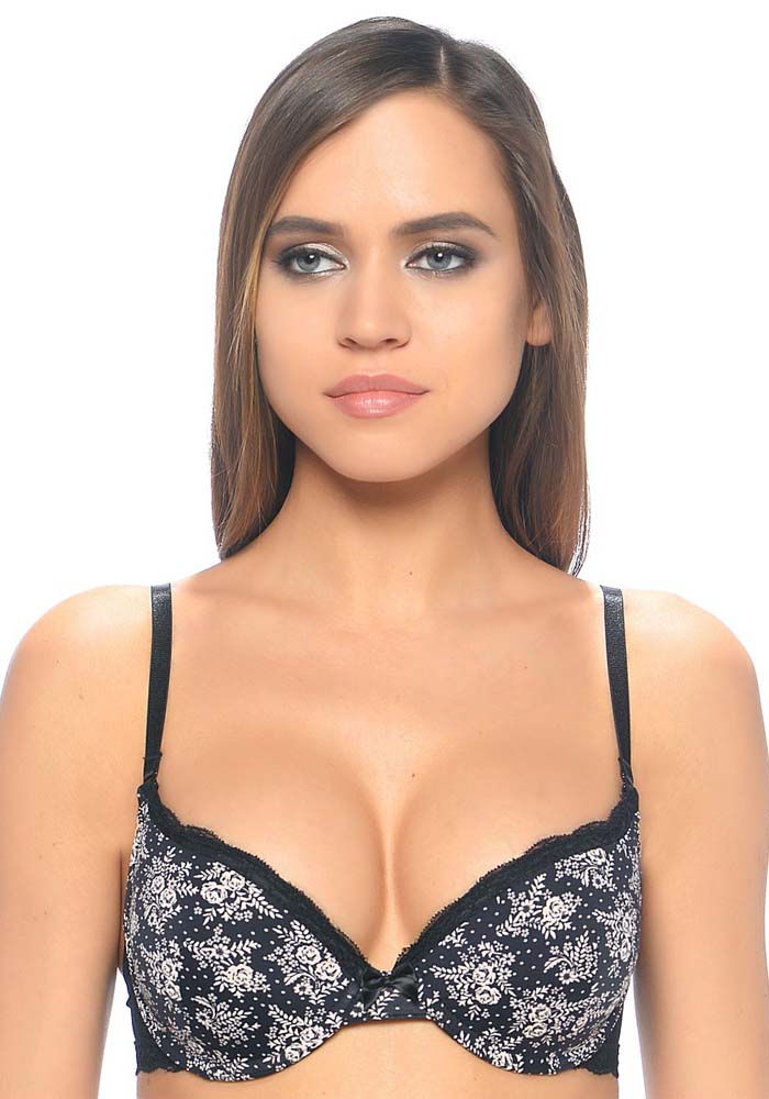 Бюстгальтер классической формы с формованной чашкой с Push-ap для размеров 70AB, 75ABC, 80B и без Push-ap для размеров 70C, 75DE, 80CDE, 85BCD. Детали бюстгальтера выполнены из эластичного принтованного полотна и эластичной жаккардовой сетки, декорированы узким кружевом. Центральная деталь декорирована бантиком. Бретели эластичные, съёмные.