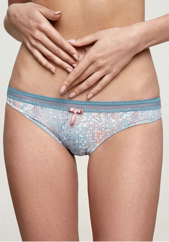 Трусики классической формы из набивного полотна. Отделка сеткой на поясе. Передняя деталь украшена бантиком. Ластовица выполнена из хлопка.