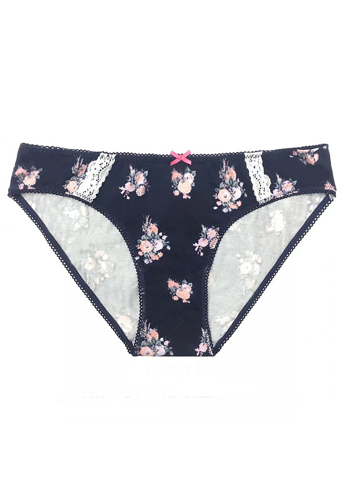 Женские трусики из набивного полотна, украшены атласным бантиком и кружевом.