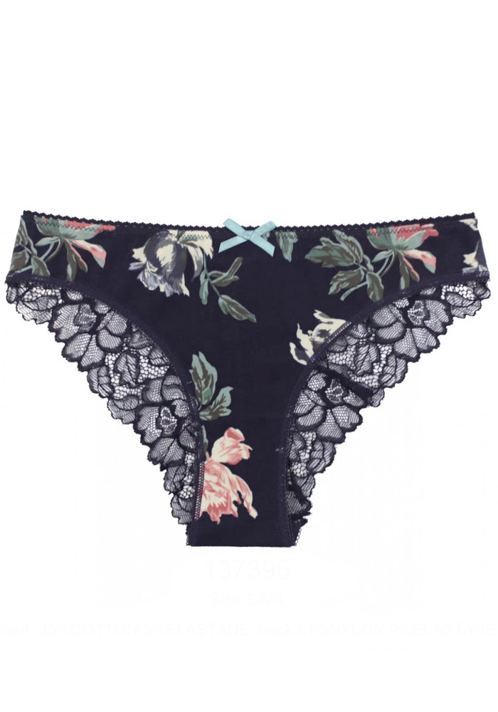 Женские трусики из набивного полотна и кружева, украшены атласным бантиком.
