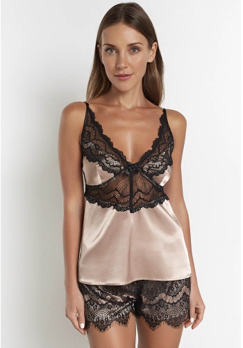 Комплект из атласного топа и шорт. Топ с V-образным вырезом декольте и мягкой чашкой с вытачкой, декорирован контрастным кружевом и атласным бантиком по центру. Бретели регулируемые, несъемные. Шорты с резинкой на талии, декорированы контрастным кружевом.