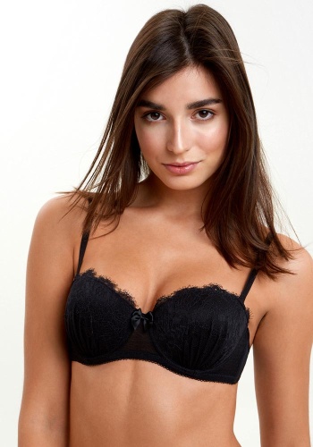 Бюстгальтер формы "балконет" на косточках, выполненный из кружева и жаккардовой сетки. Формованные чашки с Push-up для размеров 70AB, 75ABC, 80B и без Push-up для размеров 70C, 75DE, 80CDE, 85BCD. Максимально открытый вырез декольте. Центральная деталь декорирована атласным бантиком. Бретели регулируемые, съемные. Силиконовый кант сверху обеспечивает отличное прилегание и удерживает бюстгальтер на месте без бретелек. Застежка на два крючка. Бюстгальтер отлично приподнимает грудь любого размера.