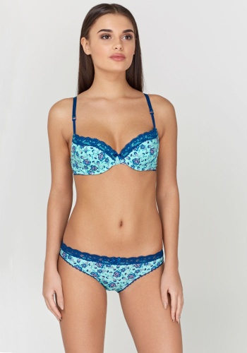 Трусики классические выполнены из эластичного принтованного хлопкового полотна и узкого кружева, декорированы эластичной лентой с фестонами. Передняя деталь декорирована бантиком.