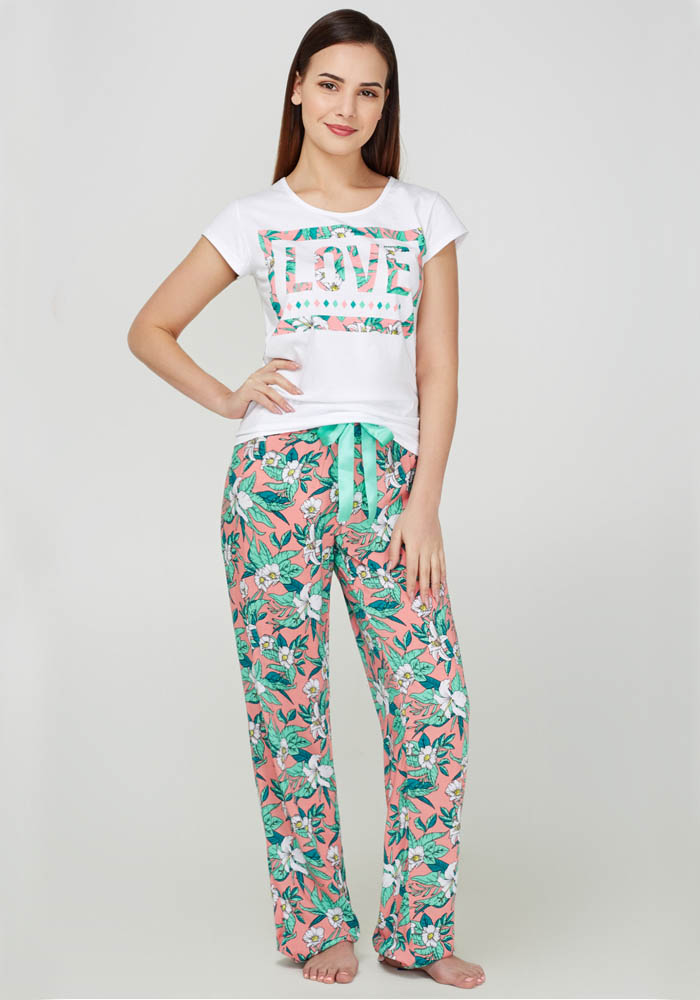 Пижама состоит из футболки и брюк. Футболка из эластичного хлопкового полотна с принтом спереди.