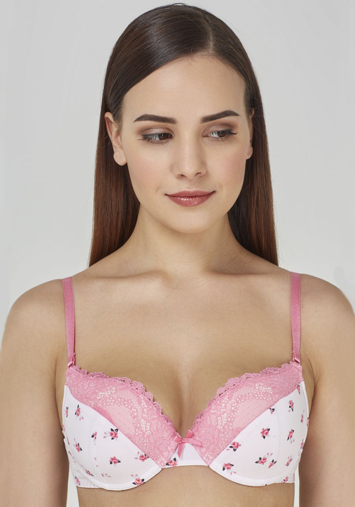 Бюстгальтер классической формы с формованной чашкой с Push-ap для размеров 70AB, 75ABC, 80B и без Push-ap для размеров 70C, 75DE, 80CDE, 85BCD. Детали бюстгальтера выполнены из эластичного принтованного полотна и кружева. Центральная деталь декорирована бантиком. Бретели эластичные, съёмные.