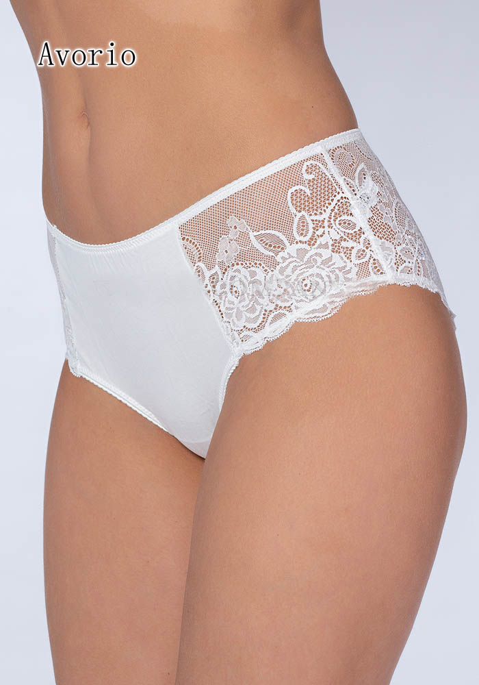 Классические трусы-слипы из хлопка с эластаном, по бокам и сзади кружевные вставки, ажурная отделка края, средняя посадка.