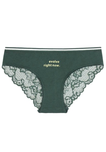 Женские трусики из однотонного полотна и кружева. Украшен надписью.