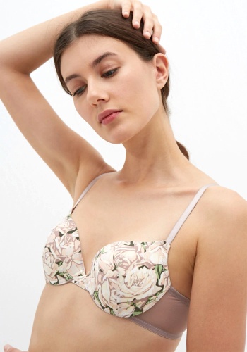 Бюстгальтер классической формы с формованной чашкой с Push-up для размеров 70АВ, 75АВС, 80В и без Push-up для размеров 70C, 75D, 80C. Детали бюстгальтера выполнены из эластичного полотна и сетки. Бретели эластичные, не съемные. Спереди украшен бантиком.