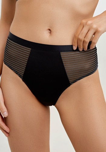 Женские трусы-стринги с завышенной талией, выполнена из эластичного полотна и эластичной сетки. Ластовица выполнена из хлопка.