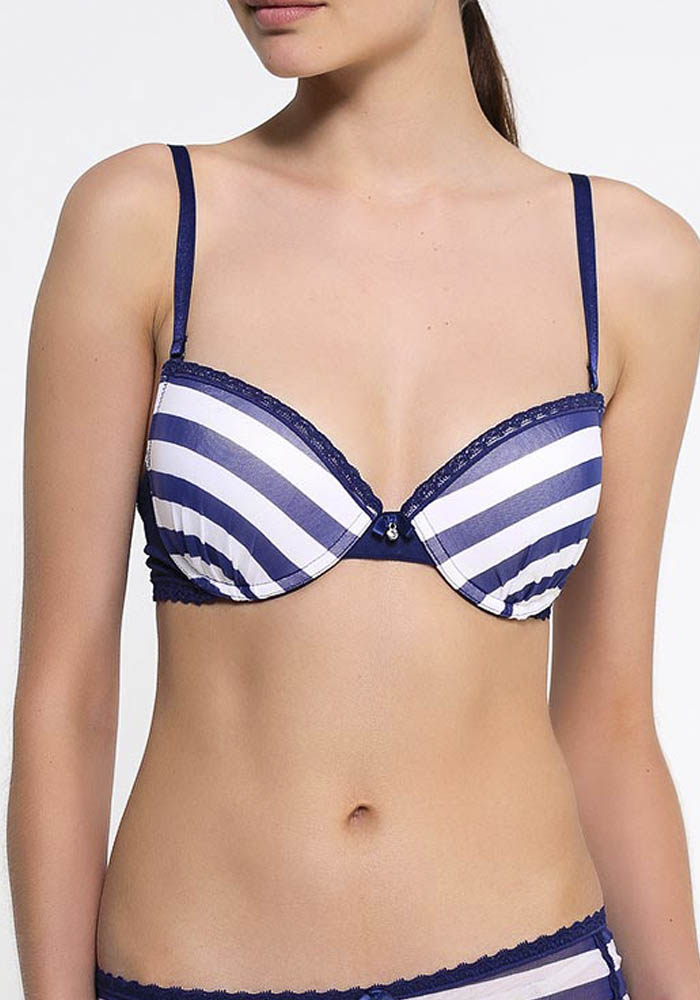 Бюстгальтер классической формы с формованной чашкой с Push-up для размеров 70АВ, 75ABC, 80B и без Push-up для размеров 70C, 75DE, 80CDE, 85BCD. Детали выполнены из сетчатой ткани в сине-белую полоску. Чашечки на косточках декорированы сборками. Центральная деталь декорирована атласным бантиком с подвеской. Бретели эластичные, съёмные.