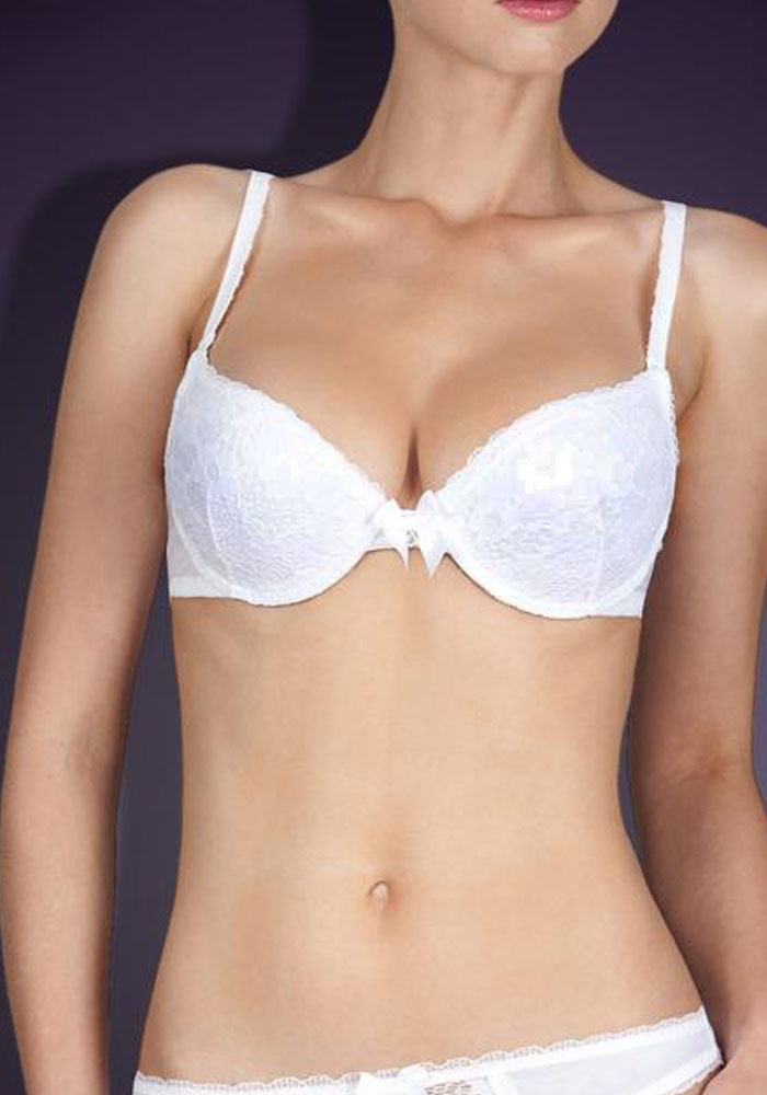 Бюстгальтер классической формы с формованной чашкой с Push-up для размеров 70АВ, 75АВС, 80В и без Push-up для размеров 70C, 75DE, 80CDE, 85BCD. Детали бюстгальтера выполнены из эластичного кружевного полотна и тонкого эластичного полотна, декорированы узким кружевом и эластичной лентой с фестонами. Центральная деталь декорирована шифоновым бантиком с подвеской. Бретели эластичные, съёмные. Передняя бретель декорирована узким кружевом.