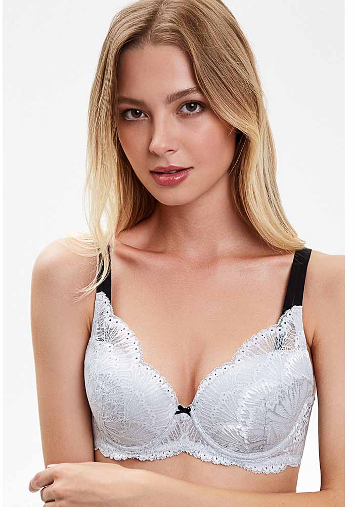 Бюстгальтер формы T-Shirt с формованной чашкой без Push-ap для всех размеров. Детали бюстгальтера выполнены из эластичной сетки и кружева. Чашка декортрована кружевом. Центральная деталь декорирована бантиком. Бретели эластичные, не съёмные.