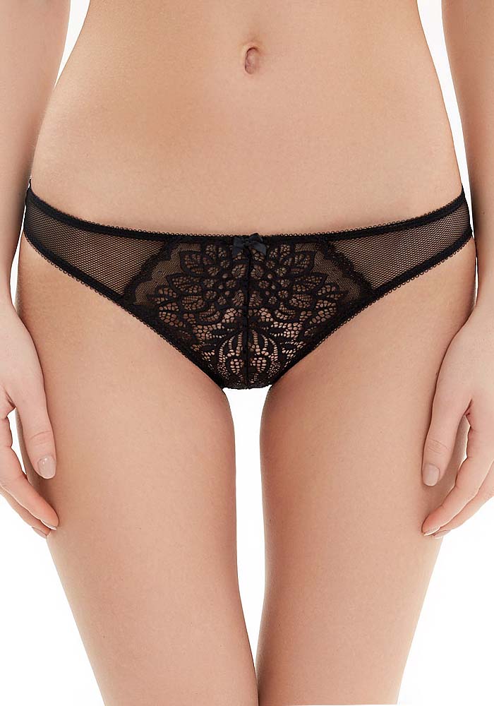 Трусики классические выполнены из эластичной сетки и эластичного кружева. Передняя деталь декорирована бантиком.