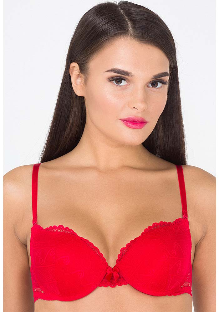 Бюстгальтер классической формы с формованной чашкой с Push-ap для размеров 70AB, 75ABC, 80B и без Push-ap для размеров 70C, 75DE, 80CDE, 85BCD. Детали бюстгальтера выполнены из кружевного полотна и узкого кружева, декорированы эластичной лентой с фестонами. Центральная деталь декорирована атласным бантиком. Бретели эластичные, съёмные.