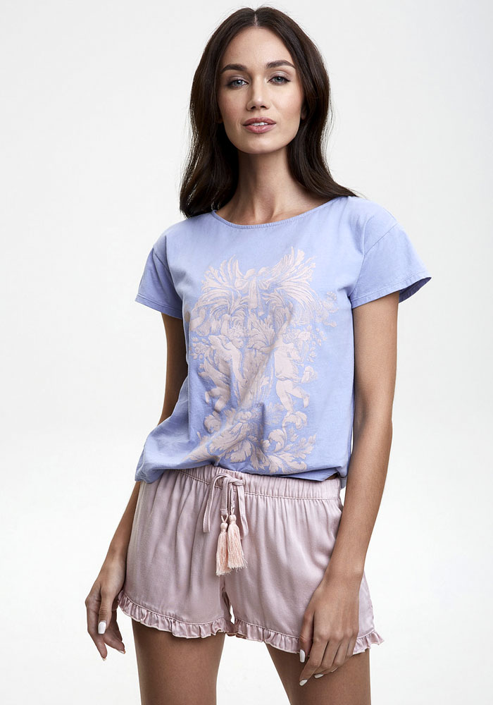Пижама, состоящая из футболки и шорт. Футболка из хлопкового трикотажа, с круглым вырезом горловины и заниженной линией плеча. Перед декорирован ярким принтом. Шорты из фактурной вискозной ткани с оборками снизу. Талия на резинке и завязках с декоративными кисточками.