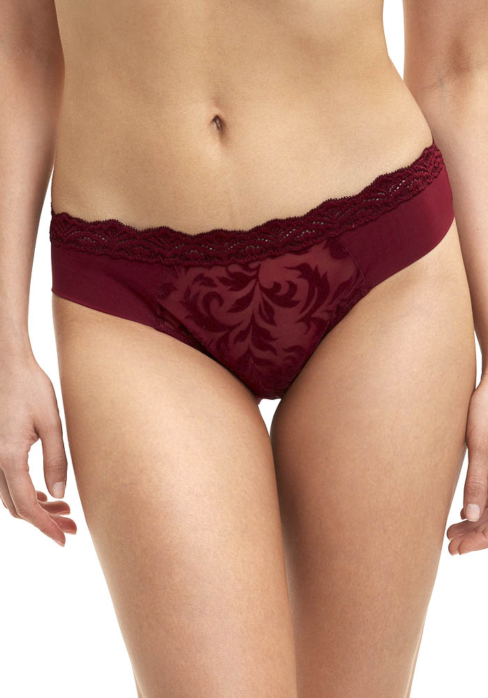 Женские классические трусики. Передняя деталь выполнена из эластичной сетки с рисунком. Задняя деталь выполнена из эластичной сетки и кружева. Пояс украшен кружевной полоской.