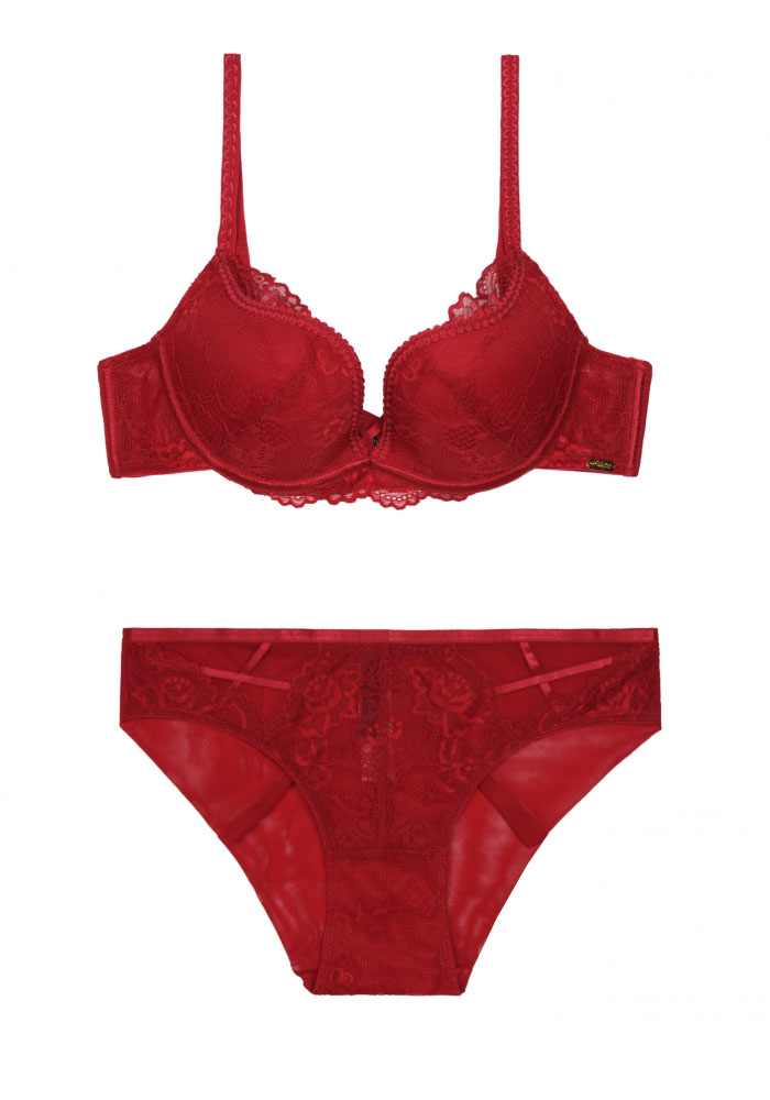 Стильный кружевной комплект состоит из бюстгальтера и трусиков-слипов.
