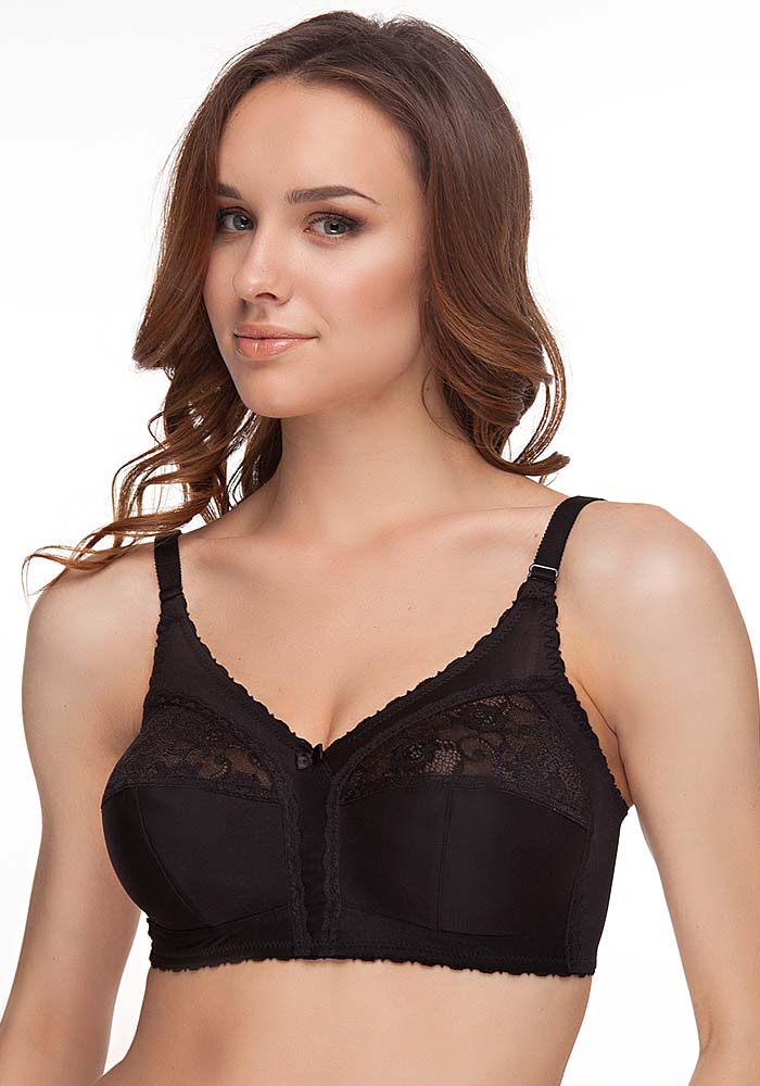 Бюстгальтер с мягкими чашками без каркасов. Непревзойденный комфорт обеспечивает удобная конструкция чашек, регулируемые спереди бретели и широкий стан. Нижние детали чашек на подкладке из тканого хлопкового полотна. Отделка - узкое кружево, бантик.