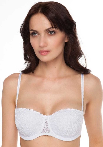 Бюстгальтер «балконет» из эластичного кружева и эластичного трикотажного полотна. На каркасах. Чашки на дубляже с хлопком. Съемные бретели. Силиконовая тесьма по верхнему и нижнему краю бюстгальтера. Упругие пластины в боковых деталях стана. Отделка – бантик.