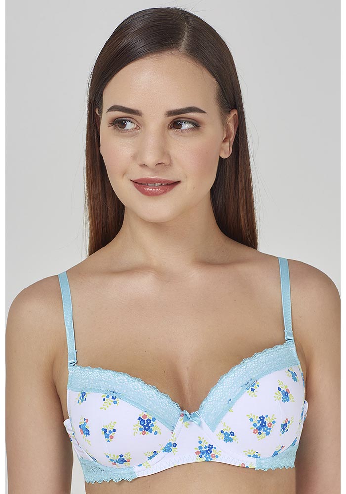 Бюстгальтер формы T-Shirt с формованной чашкой с небольшим мягким Push-ap для всех размеров. Детали бюстгальтера выполнены из эластичного принтованного полотна и узкого кружева. Центральная деталь декорирована бантиком. Бретели эластичные, съёмные.