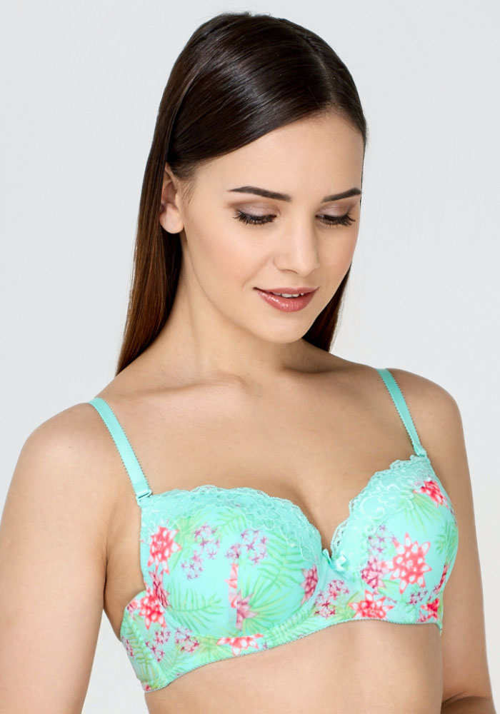 Бюстгальтер формы T-Shirt с формованной чашкой с небольшим мягким Push-ap для всех размеров. Детали бюстгальтера выполнены из эластичной принтованной сетки и узкого кружева. Центральнвая деталь декорирована бантиком. Бретели эластичные, съёмные.