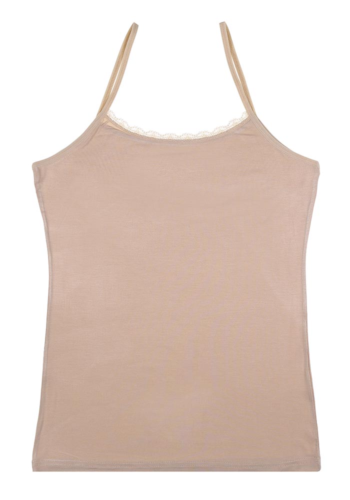Женская однотонная майка. Ворот украшен мелким кружевом.