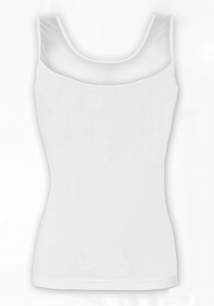 Женская майка на широких бретельках, украшенная U-образной прозрачной вставкой.