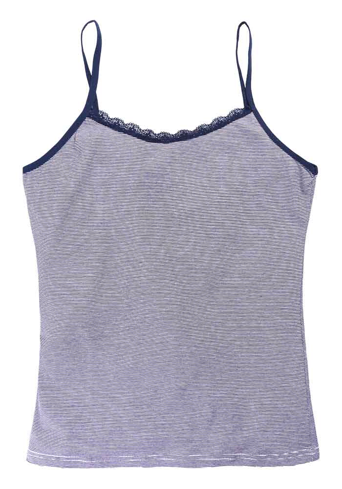 Женская майка на тонких бретелях. Вырез украшен мелким кружевом.