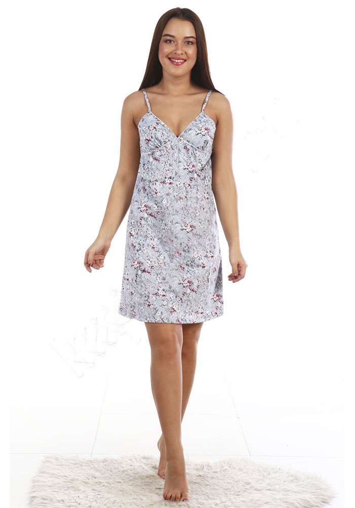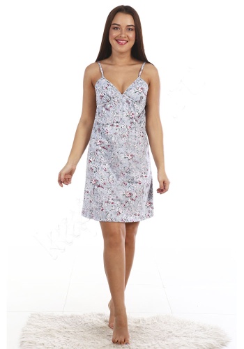 Сорочка полуприлегающего силуэта, длиной выше колена. На тонких бретелях, с V-образным вырезом, отрезная под грудью.