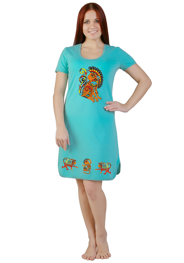Сорочка женская "Хану" полуприлегающего силуэта, длиной выше колена. Круглый вырез горловины, рукав короткий втачной. Горловина, низ рукавов и фигурный низ изделия окантованы. На полочке принт.