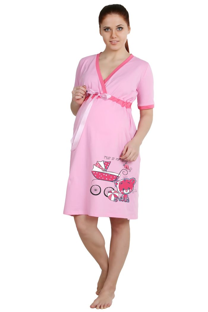 Сорочка женская "Мой малыш" для беременных и кормящих. Полочка с V- образным вырезом горловины, отрезным под грудью лифом с обтачкой из отделочного материала, и широкой кулиской с атласной лентой. Рукав короткий втачной, на манжете из отделочного материала. На полочке внизу принт.