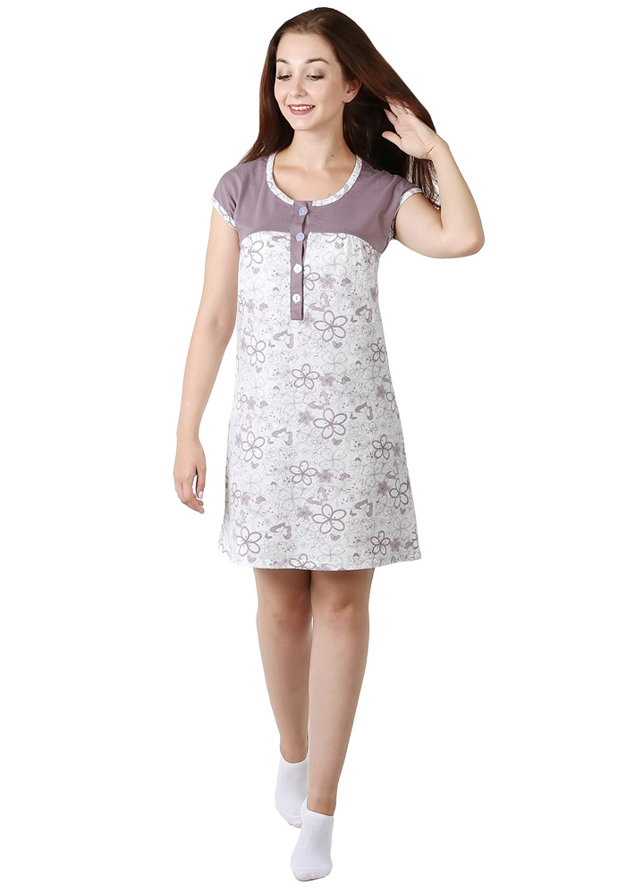 Сорочка "Лаванда" полуприлегающего силуэта длиной до колена с планками с застежкой на петли - пуговицы. Кокетки выполнены из гладкокрашеного полотна, нижняя часть – из набивного. Круглая горловина и цельнокроеный короткий рукав окантованы бейкой. Низ изделия обработан швом «в подгибку».