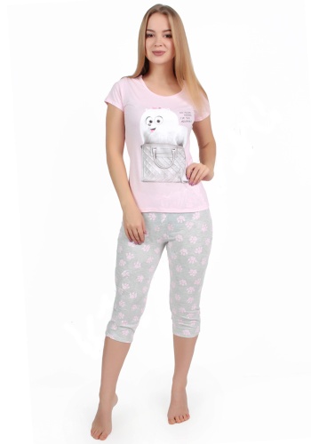 Комплект состоит из ярких бридж и однотонной футболки. Бриджи на резинке, создающие дополнительный комфорт. Футболка украшена декоративным принтом.