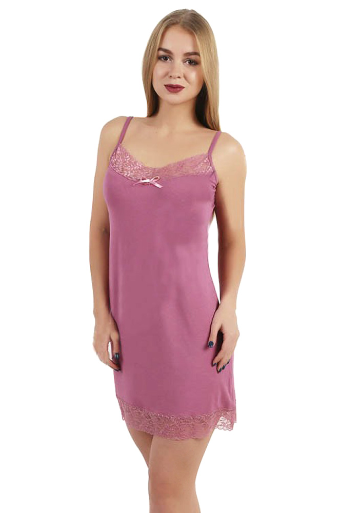 Сорочка,полу прилегающего силуэта, длиной выше колена. На тонких бретелях,с V-образным вырезом. Украшена эластичным кружевом.
