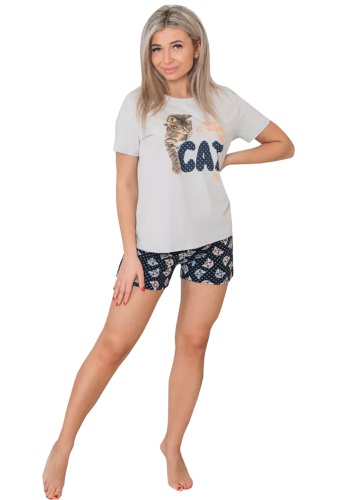 Женская пижама "Кэт" с шортами. Футболка однотонная, короткий рукав. Украшен принтом. Шорты выполнены из принтованного полотна. Втачной карман.
