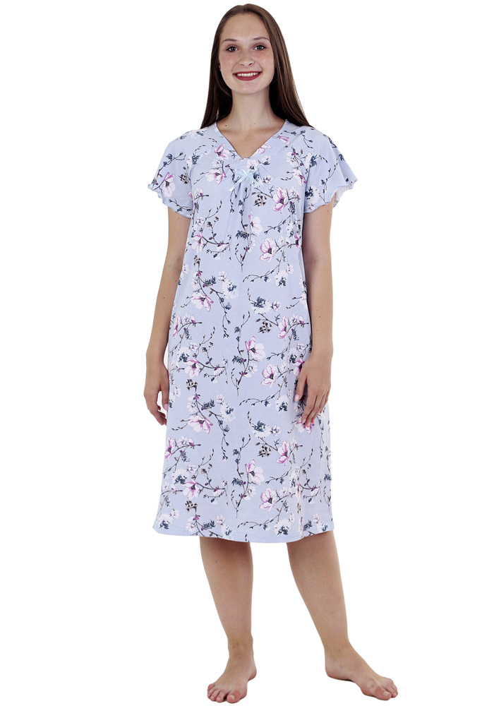 Сорочка женская из набивного полотна прямого силуэта с коротким рукавом-реглан. «V»-образная горловина полочки обработана обтачкой, горловина спинки окантована бейкой из основного полотна. Низ изделия обработан швом «в подгибку», низ рукавов – краеобмёточной машиной.