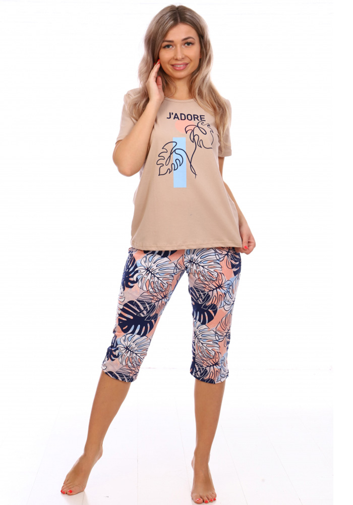 Женская пижама с бриджами. Футболка однотонная, спереди украшена рисунком. Бриджи выполнены из принтованного полотна.