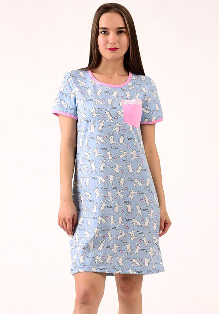 Женская сорочка из принтованного полотна. На груди кармашек из ткани, которой оконтованы края выреза и рукава.
