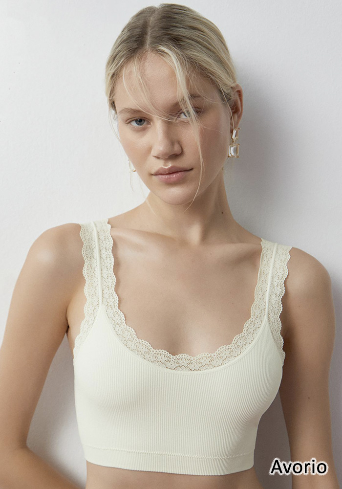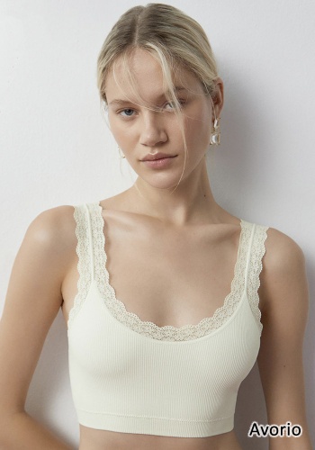 Комфортный топ "в рубчик" на широких кружевных бретелях со съемными формованными вкладышами. Верх лифа обработан ажурным кружевом с изящным цветочным рисунком. Изготовлен по бесшовной технологии из мягкой микрофибры, которая отлично пропускает воздух и обладает нежной текстурой. Топ превосходно облегает и приятно ощущается на теле благодаря отсутствию боковых швов. Хорошо сохраняет форму и цвет. Удобная вывязанная резинка обеспечивает надежную поддержку.