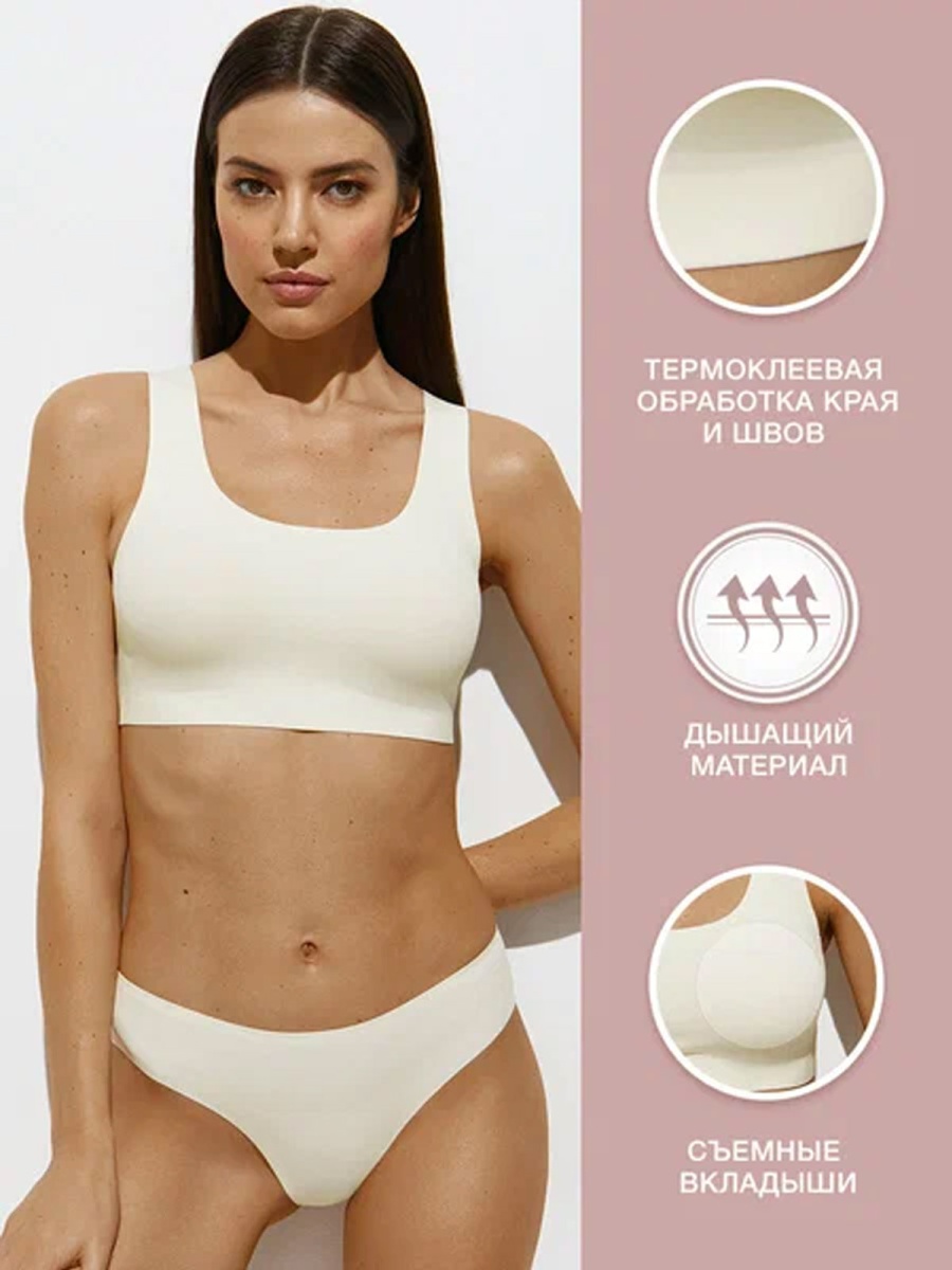 Изготовлен из гладкой микрофибры по прогрессивной технологии с использованием плоского клеевого шва и термоклеевой обработки края. Материал обладает высокой воздухопроницаемостью, приятно ощущается на теле, хорошо сохраняет форму и цвет. Передняя часть топа на подкладке дополнена съемными вкладышами. Топ превосходно облегает благодаря мягкой усиленной резинке, обеспечивает комфортную поддержку и создает эффект «второй кожи»,